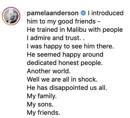 Aktrise, modele un aktīviste Pamela Andersone savu lēmumu izbeigt romantiskās attiecības pavēstījusi emocionālā ierakstā savā “Instagram” kontā, kur detalizēti izklāstījusi par to, kas noticis. Pamela Andersone 33 gadus veco draugu Adilu Rami nosaukusi par “monstru”, kurš dzīvojis “dubultu dzīvi”, jo esot paralēli uzturējis attiecības ar savu bijušo sievieti – un, iespējams, arī citām.