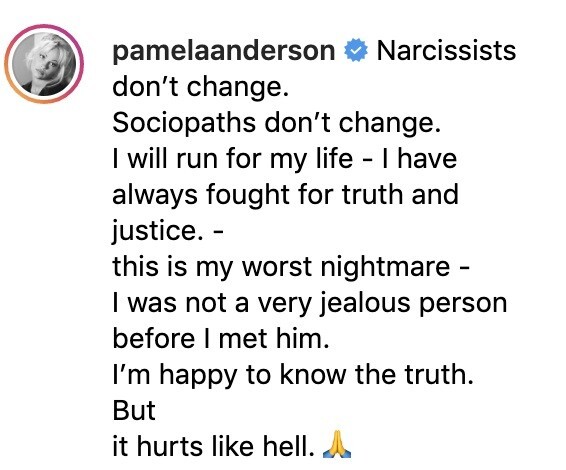 “Narcisi nemainās. Sociopāti nemainās. Es mukšu, ko kājas nes. Es vienmēr esmu iestājusies par patiesību un taisnību,” raksta Pamela. “Šis ir mans ļaunākais murgs… Esmu laimīga, ka zinu patiesību. Kaut arī ellišķīgi sāp.”
