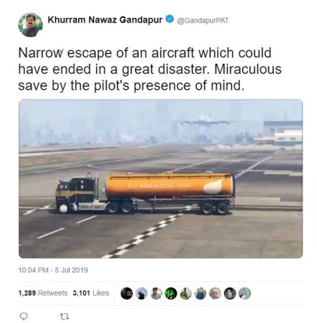 Par "Twitter" lietotāju apsmieklu kļuvis Pakistānas opozīcijas partijas līderis Kurams Navazs Gandapurs. Politiķis pagājušās nedēļas nogalē dalījās ar kādu video, kurā redzama animēta lidmašīna, kas tik tikko izvairās no sadursmes ar smago mašīnu, kas ved cisternu, ziņo "Daily Mail".