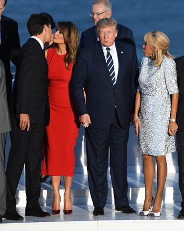 Melānija Trampa tērpusies spilgti sarkanā kleitā kopīgas fotogrāfijas uzņemšanas laikā acīmredzami sasveicinājusies ar Kanādas premjerministru Džastinu Trudo, sniedzot viņam skūpstu uz vaiga.