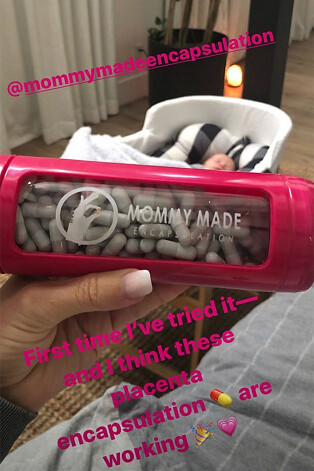 “Pirmo reizi pamēģināju un domāju, ka šīs placentas kapsulas patiešām strādā,” viņa pierakstījusi pie fotogrāfijas, kur fonā redzams arī jaundzimušais dēliņš Hadsons Londons, kurš saldi aizmidzis grozā.