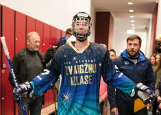 FOTO: Latvijas mūziķi lej sviedrus labdarības hokeja mačā dzīvnieku patversmes atbalstam