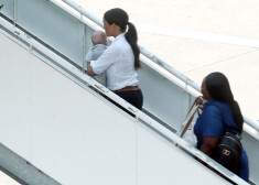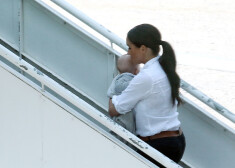Hercogiene Megana ar dēlu un auklīti Keiptaunas lidostā