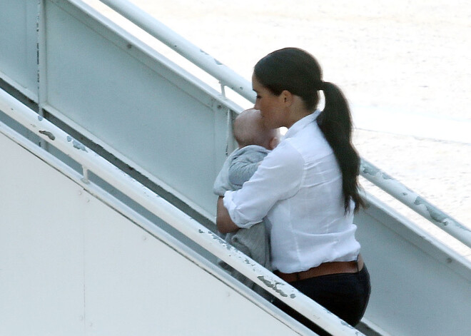 Hercogiene Megana un princis Harijs ar dēlu Ārčiju pieņemšanā Dienvidāfrikā