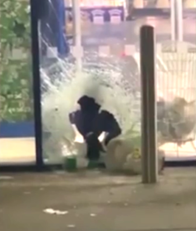 Notiekošā laikā fonā dzirdama veikala apsardzes signalizācijas skaņa. Pie izsistā stikla uz zemes redzams ķieģelis, kas, visticamāk, izmantots, lai iekļūtu veikalā.