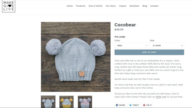 Šādu “Cocobear” cepurīti interneta mājaslapā iespējams iegādāties par 49 dolāriem. Tā ir adīta no 100% Jaunzēlandes merino vilnas, un uz tās ir norādīts meistares, kas to adīja, vārds. Ja kāda vēlas pati sev vai bērnam uzadīt šādu cepurīti, organizācijas mājaslapā par 20 dolāriem iegādājama arī pamācība.