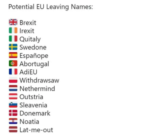 Zviedrijai - "Swedone", Dānijai - "Donemark", Nīderlandei - "Nethermind", Itālijai - "Quitaly", Lietuvai - "Lithawaynia". Virknei Eiropas Savienību valstu ilgi nebūtu jāprāto par to, ar kādu saukli atvadīties un izstāties no valstu apvienības.
