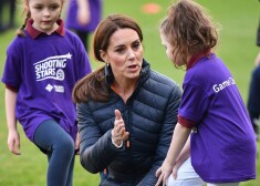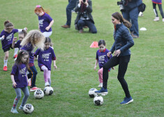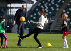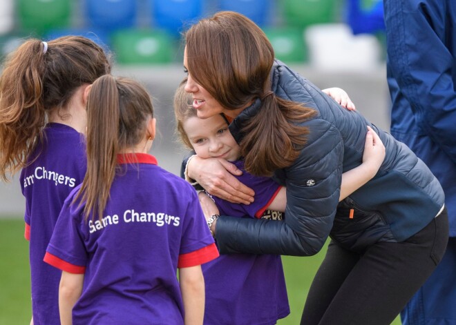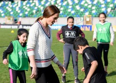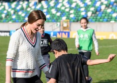 Hercogiene Ketrīna Ziemeļīrijā piedalās futbola treniņā kopā ar skolēniem
