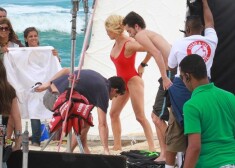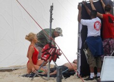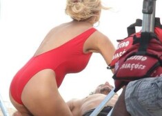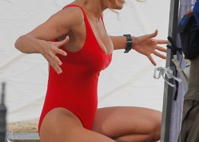 Pamela Andersone atkal filmējas „Pludmales patruļas” sarkanajā peldkostīmā
