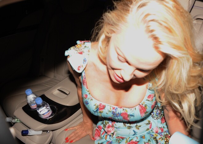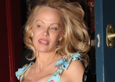 Paparaci pieķēruši aktrisi Pamelu Andersoni, kad viņa jautrā omā dodas prom no kāda bāra Londonā 2017. gada pavasarī.