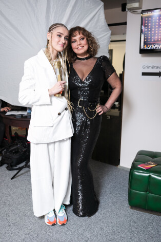 Aizkulisēs neparasti lieliskā noskaņojumā bija dziedātāja Linda Leen, kura, atšķirībā no daudziem citiem pasākumiem, kad lielākoties vairās no fotogrāfiem, šoreiz labprāt fotografējās savā skaistajā, sievišķīgajā vakarkleitā gan kopā ar grimēšanas meistari Unu Bernatoviču, gan jauno Latvijas skatuves spīdekli Patrishu, kam Linda ar lepnumu pasniedza gada debijas balvu.