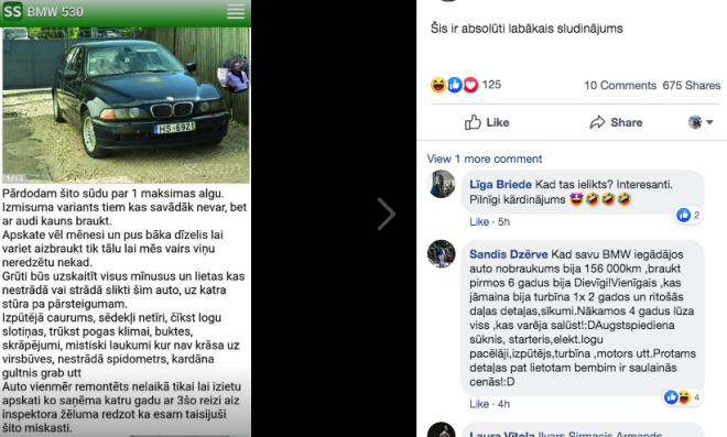 Sociālā tīkla "Facebook" lietotājs Jānis Grende savā profilā padalījies ar visai amizantu "ss.com" ievietotu sludinājumu, kurā tiek pārdota BMW 530 markas automašīna.