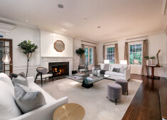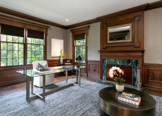 No plašās viesistabas durvis ved un modernu kabinetu, izsmalcinātu virtuvi, ēdamzāli un dzīvojamo istabu ar kamīnu.