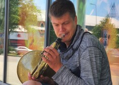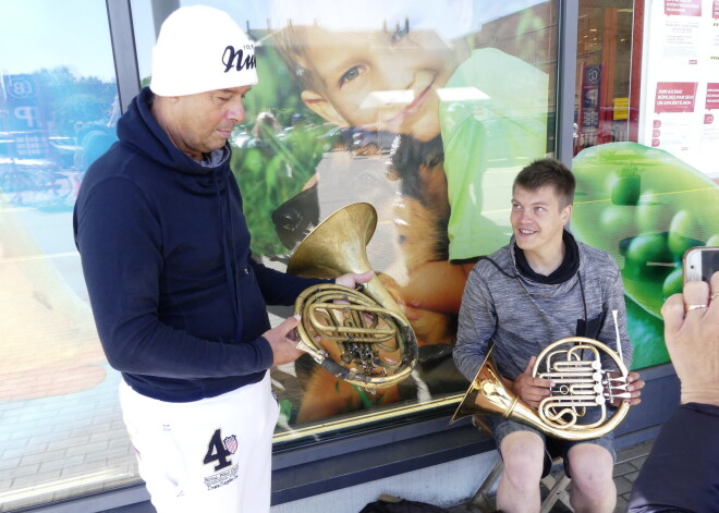 Leons Zviedris uzdāvina Liepājas ielu muzikantam mežragu