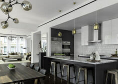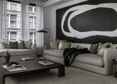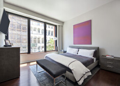 Iebūvētie grāmatplaukti, kas krāsoti neitrālos toņos, piešķir dzīvojamajām telpām nomierinošu gaisotni. Saimnieku guļamistabā drēbju skapis ar stiklotām durvīm aizņem visu sienu. Dzīvoklim ir arī sava privāta jumta terase.