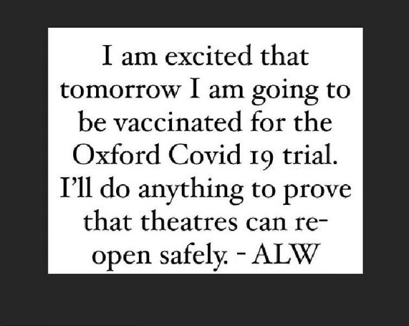Oksfordas universitāte un zāļu kompānija “AstraZeneca” strādā pie eksperimentālas Covid-19 vakcīnas izstrādes. Jau tūkstošiem brīvprātīgo Lielbritānijā, ASV, Brazīlijā un Dienvidāfrikā piedalījušies klīniskajos testos. Nākamajā etapā piekritis piedalīties arī izcilais komponists Endrū Loids Vēbers. “Es darīšu visu, lai pierādītu, ka teātri atkal droši var strādāt,” viņš norādījis.