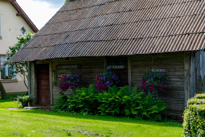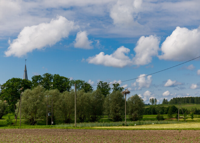 Laukā staba galā lielā ligzdā dzīvo stārķu ģimene. Var saskatīt, ka šogad tā ir liela – četri pusaugu putnēni. “Viņi ir mūsu mājas pastāvīgie iemītnieki,” stāsta Jānis. “Laika gaitā ligzda kārtu kārtām bija uzaugusi tik milzīga, ka pirms gadiem trim pati no sava svara novēlās. Labi, ka tas bija vasaras beigās, kad stārķēni jau paaugušies. Māsas vīrs nostiprināja paliktni, un nākamajā gadā viņi sāka būvēties no jauna.”