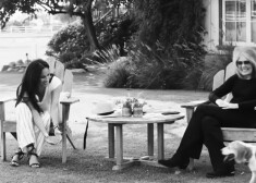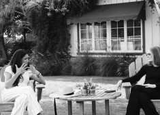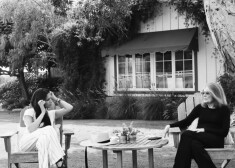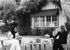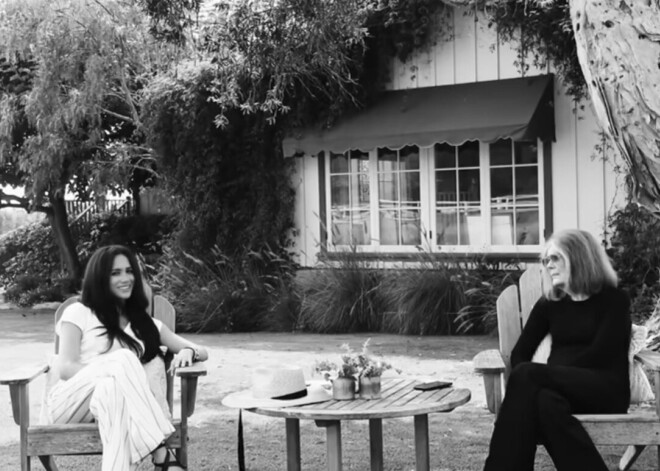 Megana Mārkla savas mājas pagalmā sniedz interviju sieviešu tiesību aizstāvei Glorijai Steinemai