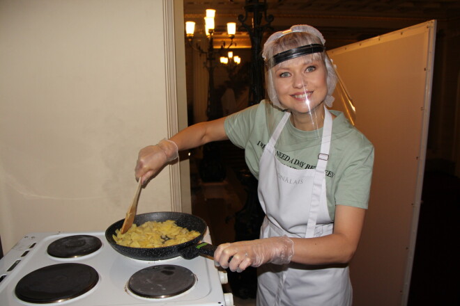 Nacionālā teātra pirmizrādē Dita Lūriņa sagaida apmeklētājus, cepot kartupeļus
