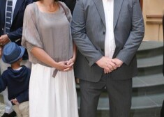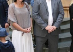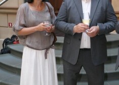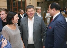 Ekspremjers Aigars Kalvītis ar kundzi Kristīni gleznu izstādes „Aleksandrs Drēviņš un Nadežda Udaļcova. Laiku virpulī” atklāšanas svinībās 2015. gada 14. ...