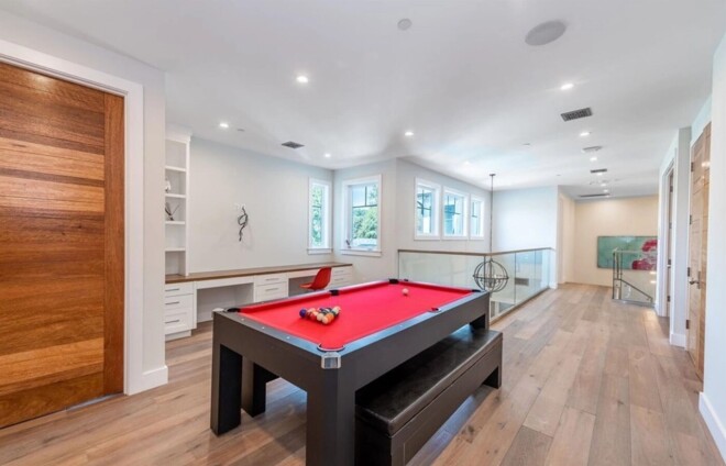 Pirmajā stāvā ir ierīkota spēļistaba, apartamenti viesiem, kā arī darba kabinets strādāšanai no mājām.