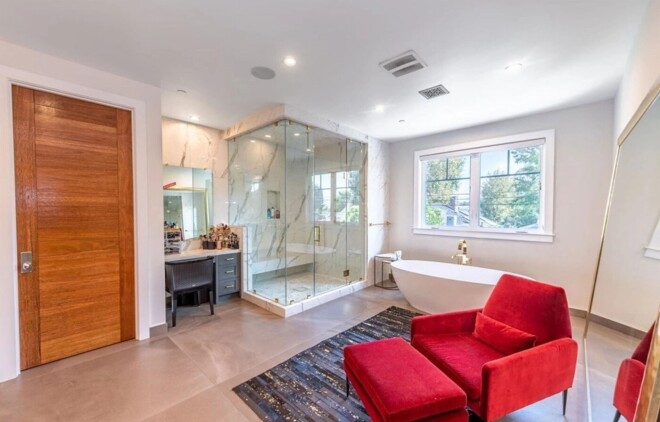 Saimnieku guļamistaba iekārtota mājas aizmugurējā pusē, lai nodrošinātu maksimālu privātumu. Tajā ir kamīns un divas atsevišķas garderobes telpas – viņam un viņai. Saimnieku ērtībām te līdzās ir ārkārtīgi plaša vannasistaba, kurā pat ievietots sarkans atpūtas krēsls, lai saimnieki varētu ērti ļauties dažnedažādām skaistumkopšanas procedūrām un sevi palutinātu. Vannasistabā ir gan vanna, gan duškabīne.
