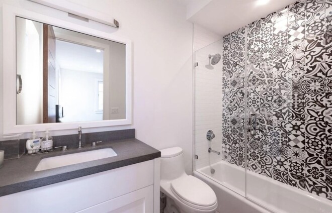 Iebūvētais vīna pudeļu uzglabāšanas skapis izklāts ar baltiem ķieģeļiem un savieno ēdamzāli ar plašo virtuvi, kurā mirdz marmora darba virsmas un balti “Shaker” stila skapīši. Iekārtas ir no nerūsējoša tērauda, bet izlietņu armatūra no misiņa.