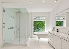 Līdzās guļamistabai ir garderobe ar izgaismotiem plauktiem un stikla durvīm, kas sargā apģērbus, apavus un aksesuārus no putekļu uzkrāšanās.