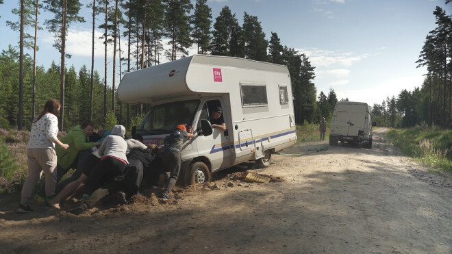 “Ceļš bija šaurs, ar maz iespējām, kur apgriezties. Pamanīju kādu kabatiņu, kur varētu apstāties, taču tur grants vēl nebija pietiekami noblietēta. Jutu, ka mans kemperis sāk iestigt. Man kaut kā izdevās izbraukt, taču Matīss, kurš brauca aiz manis, gan pamatīgi iesēdās – līdz pat motora pannai. Atbilstošas troses, ar ko izvilkt kemperi, mums nebija, visu nakti mēģinājām auto izrakt, likām zarus apakšā, bet nekā. Atradāmies meža vidū, bijām jau apzvanījuši visus iespējamos paziņas, kas varētu atrasties 50 kilometru rādiusā un palīdzēt. Es pat zvanīju tētim, kurš strādā ceļa būvē, jo pamanījām ceļarulli, kas blietēja šīs kabatiņas. Domāju, ka varbūt tētis var noskaidrot, kurš uzņēmums taisa to meža ceļu, un tad sazvanīt traktoristu, bet arī tas neizdevās,” atceras Roberts.