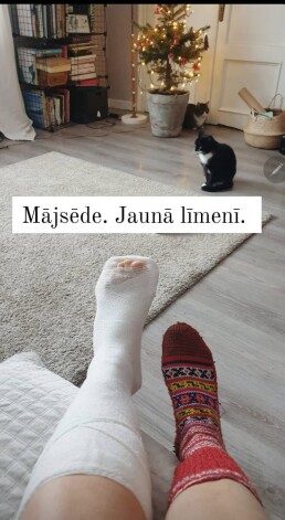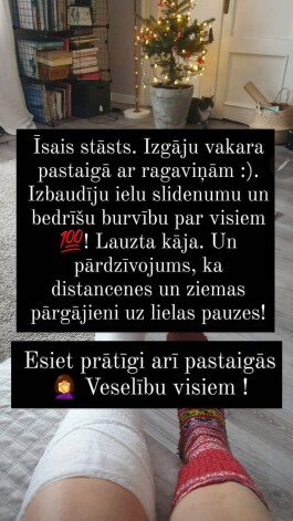 Viņa arī atklākjusi "īso stāstu", kā nelaimes gadījums noticis: "Izgāju vakara pastaigā ar ragaviņām. Izbaudīju ielu slidenumu un bedrīšu burvību par visiem 100. Lauzta kāja. Un pārdzīvojums, ka distancenes un ziemas pārgājieni uz lielas pauzes."