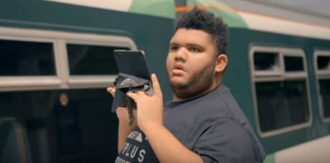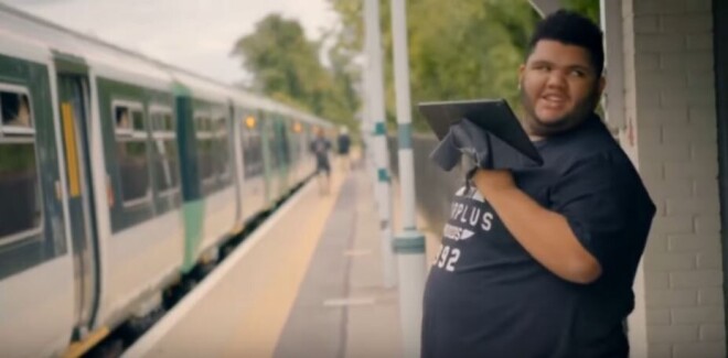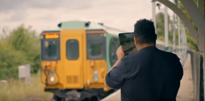 “Vai drīkstu pievērst jūsu uzmanību? Šis vilciens sastāv no 12 vagoniem. Dienvidrietumu dzelzceļa servisam uz Gilfordu ceturtā platforma pulksten 11:34,” Hārvijs nofilmēts, dzelzceļa stacijā atdarinām vilcienu izziņotāja paziņojumus.