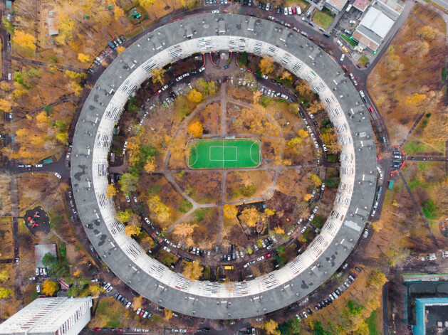 Tā Maskavas rietumos radās divas milzīgas deviņstāvu ēkas kā lieli riņķi, kuras vietēji iedzīvotāji to formas dēļ nosauca par “bubļikiem”. Mājas būvēja no tipveida paneļiem, katru sekciju “ielokot” pieļaujamo tehnoloģisko atkāpju rāmjos – sešu grādu leņķī, lai beigās iznāktu apļveida celtne. Pirmo māju, kas tapa pēc arhitekta Jevgeņija Stamo un inženiera Aleksandra Markelova projekta, uzcēla 1972. gadā Ņežinska ielā ar 913 dzīvokļiem, bet otru identisku ar 936 dzīvokļiem uzcēla tikai pēc septiņiem gadiem – 1979. gadā Dovženko ielā.