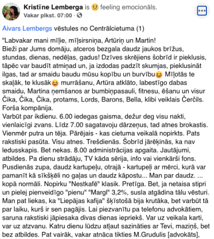 Pie ieraksta Kristīne atzīmējusi, ka "jūtas emocionāla". Turpat pie teksta norādīts, ka publicētais ieraksts ir Aivara Lemberga vēstules no Centrālcietuma. Tajās apsūdzētais Ventspils domes priekšsēdētājs pastāsta par savu ikdienu cietumā: