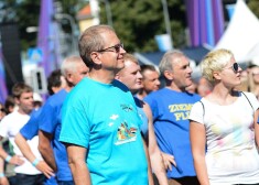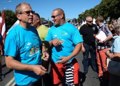 Rīgas vicemēra Andra Amerika un spēkavīra Agra Kazeļņika prieks pēc uzvaras Rīgas svētku virves vilkšanas sacensībās.
