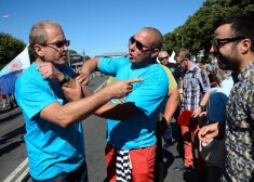 Priecājoties par uzvaru Rīgas svētku tradicionālajās “Lielās virves vilkšanas sacīkstēs”, Rīgas vicemērs Andris Ameriks metās spēkavīra Agra Kazeļņika apskāvienos.
