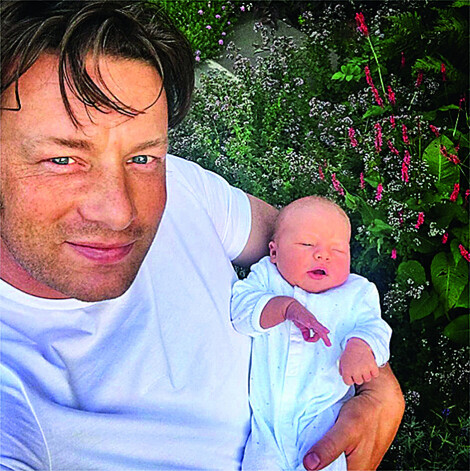 Šefpavārs Džeimijs Olivers pasauli ar savu piekto bērnu Riveru iepazīstināja ar sociālā tīkla "Instagram" starpniecību, fonā atrādot savu mazdārziņu: “Ar dēlu izklaidējamies dārzeņu dobēs!”