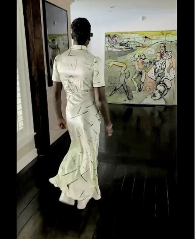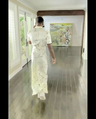 Aizvadītajā sestdienā dziedātāja padalījās ar video, kurā viņas 15 gadu vecais adoptētais dēls redzams, staigājam pa māju zīmola “Mae Couture” krēmkrāsas zīda kleitā.