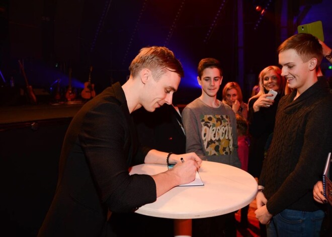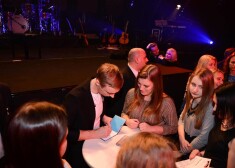 Dons sniedz autogrāfus savām lielākajām fanēm pēc koncerta „Palladium” koncertzālē 2015. gada 13. februārī.