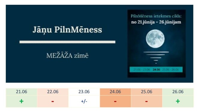 • kamēr Pilnmēness Mežāzī no 24. līdz 26.jūnijam – pazeminās dzīvības enerģija, tāpēc uzmanīgi ar nakts gulēšanām dabā, atūdeņošanos un ķermenim toksisku pārēšanos, pārdzeršanos;