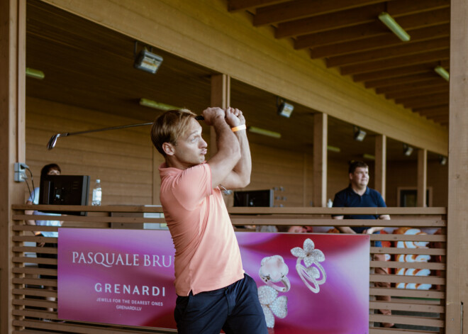 FOTO: Daumants Kalniņš, Dināra Rudāne un citi Jūrmalas festivāla mākslinieki apgūst golfa prasmes