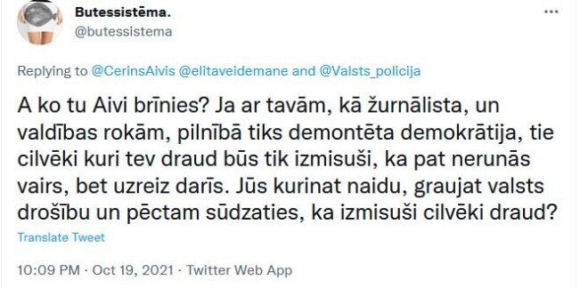 Reakcija no kārtības sargiem bija vienkārša – lieta atteikta, jo neesot nozieguma sastāva. “Es jau tos policistus saprotu. Viņi dara savu darbu likuma ietvaros, bet pēc likuma šādas darbības netiek uzskatītas par reāli izteiktiem draudiem dzīvībai,” nopūšas Aivis, turpinot: “Bet tam tiešām var būt arī smagas sekas. Šie cilvēki draud visiem – gan žurnālistiem, gan politiķiem, gan mediķiem, gan apsargiem, pārdevējiem un citiem. Jā, varbūt policijai ir taisnība, ka draudi ir nekaitīgi, bet ja nu atradīsies kāds psihiski nelīdzsvarotāks, kurš nolems tos īstenot? Ko tad? Kurš būs tas brīdis, kad no vārdiem ķersies pie darbiem? Tas nule kā jau notika Lietuvā, kad kāds sašāva veikala apsargu, kad viņš lūdza uzvilkt sejas masku.”