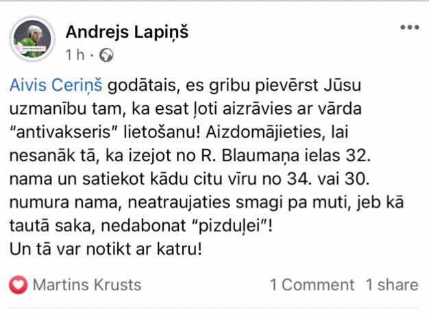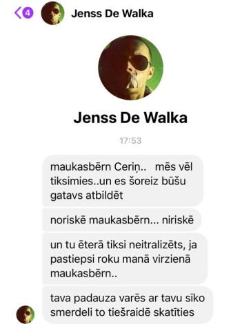 Bet tajā pašā vakarā tiešraidē savā sociālajā kontā teica, ka man vajag pārgriezt rīkli, ka mana sieva ir kuce, bet bērns – smerdelis.