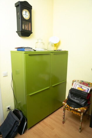 Interesanta izvērtusies krāsu un toņu piemeklēšana. “Aurēlija paprasīja man visādu krāsu šalles, lakatus, un tos citu pēc cita klāja pāri skapīšiem, lai atrastu īsto krāsu. Lietā likta pat Sises rūtainā sega. Toreiz biju atgriezusies no sēņošanas, un grozā bija sūnas. Pēkšņi Aurēlija paķēra šīs sūnas, pielika klāt pie skapīša, un abas sapratām – jā, šis ir īstais tonis! Tad ar savu sūnu kumšķi braucu uz krāsu veikalu, piemeklēju toni, un skapīšus tādus arī nokrāsoju. Protams, ka darīju pati. Arī sienas pati esmu nokrāsojusi!” priecīgi stāsta Anna Šteina.