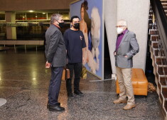 Dailes teātra aktieri Dainis Grūbe, Lauris Dzelzītis un Ilze Ķuzule-Skrastiņa boksa treniņā.