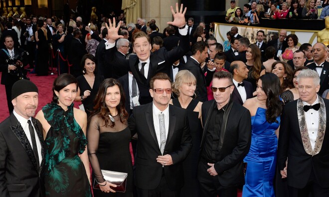 Aktieris Benedikts Kamberbačs nenogurstoši lēkājis, lai gluži kā kvēlākais fans tiktu vienā kadrā ar leģendāro mūzikas grupu "U2".
