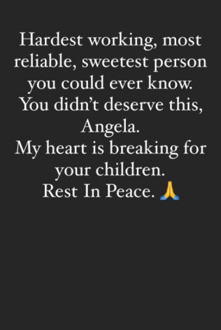 Tāpat ar paziņojumu sociālajā vietnē "Instagram" dalījusies arī mūziķe Nikija Mināža. "Visstrādīgākā, uzticamākā, jaukākā persona, kādu tu varētu zināt. Tu to nebiji pelnījusi, Andžela. Mana sirds ir salauzta par taviem bērniem. Dusi mierā."