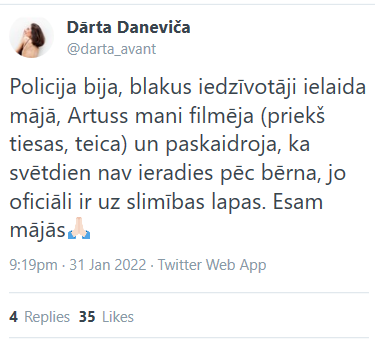 Janvāra izskaņa Latviju pārsteidza ar aktrises Dārtas Danevičas paziņojumiem, apvainojot Saeimas deputātu Artusu Kaimiņu viņu dēla Kaupo aizvešanā un arī emocionālā vardarbībā.
