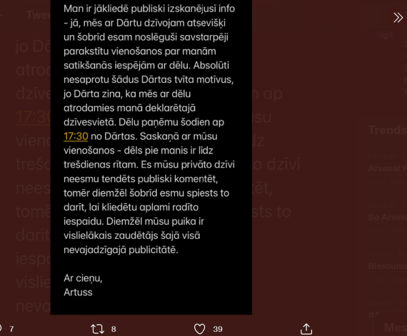 Artuss turpat tviterī atklāja, ka viņu kopdzīve ir pārtraukta: "Mēs ar Dārtu dzīvojam atsevišķi un šobrīd esam noslēguši savstarpēji parakstītu vienošanos par manām satikšanās iespējām ar dēlu. Absolūti nesaprotu šādus Dārtas tvīta motīvus, jo Dārta zina, ka mēs ar dēlu atrodamies manā deklarētajā dzīvesvietā."