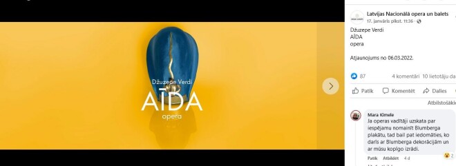 "Kas Jauns" sazinājās arī ar Latvijas Nacionālo operu un baletu (LNOB), lūdzot komentārus, kāpēc "Aīdas" režisore Māra Ķimele netika informēta par operas atgriešanos uz LNOB skatuves un kāpēc "Aīdas" plakātā vairs netiek izmantots Ilmāra Blumberga mākslas darbs. Lūk, LNOB atbilde: “Opera "Aīda" uz LNOB skatuves atgriežas pēc vairāku gadu pārtraukuma. Šis atjaunojums nav uzskatāms par jauniestudējumu, un, tāpat kā citos līdzīgos gadījumos, atjaunojumu veic LNOB štata darbinieki / režisoru asistenti.