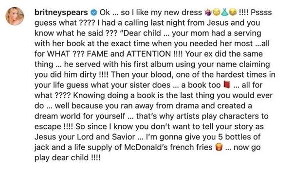 Jaunākajā “Instagram” ierakstā Britnija, domājams, bija mērķējusi arī uz “Cry Me A River” dziedātāju, nosodot viņa rīcību pēc plaši apspriestās šķiršanās 2002. gadā.